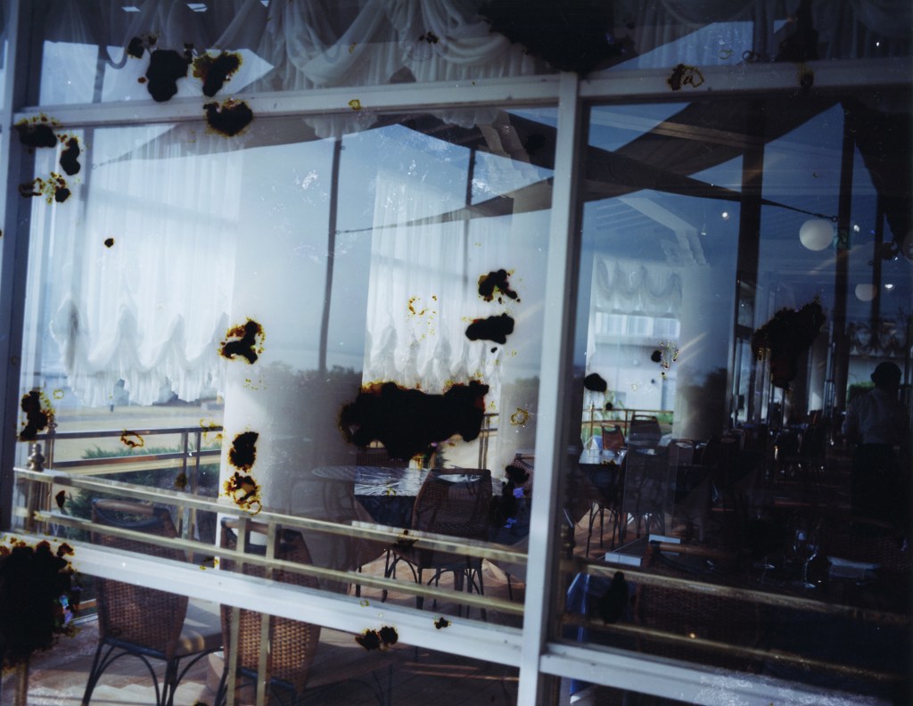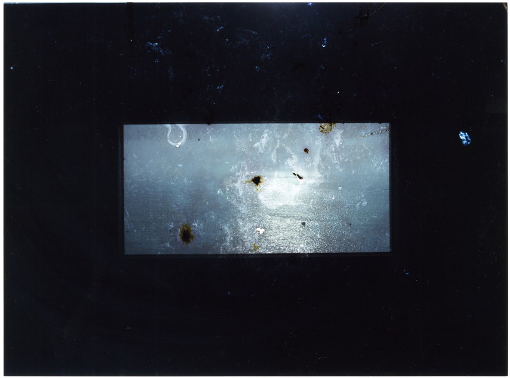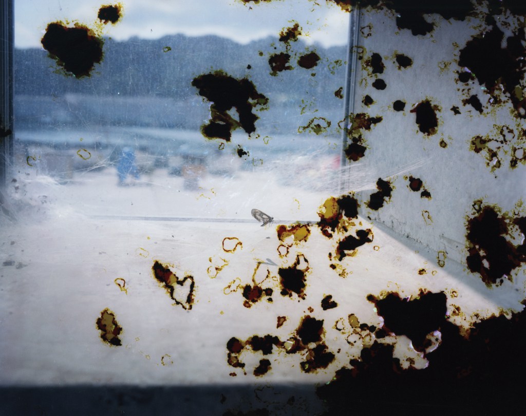 防潮堤の窓、東京湾の旧海岸線、琵琶湖疏水、人工島の廃墟など、人の営為によってめまぐるしく変化する風景の傍らに佇んでいた硝子と周辺を撮影。そのフィルムを硝子に見立てて、有機物を塗布して黴を生やし、砂や海水に触れさせるなどして、窓硝子の身に降りかかるであろう外界の刺激を圧縮して加えた。
