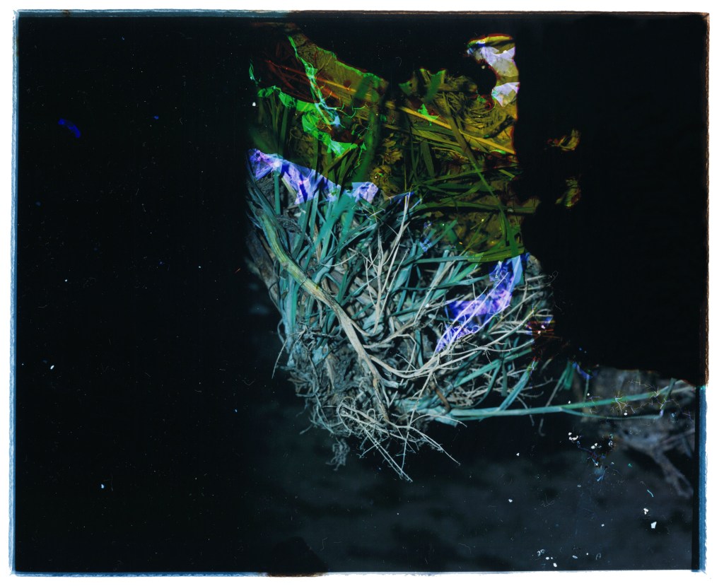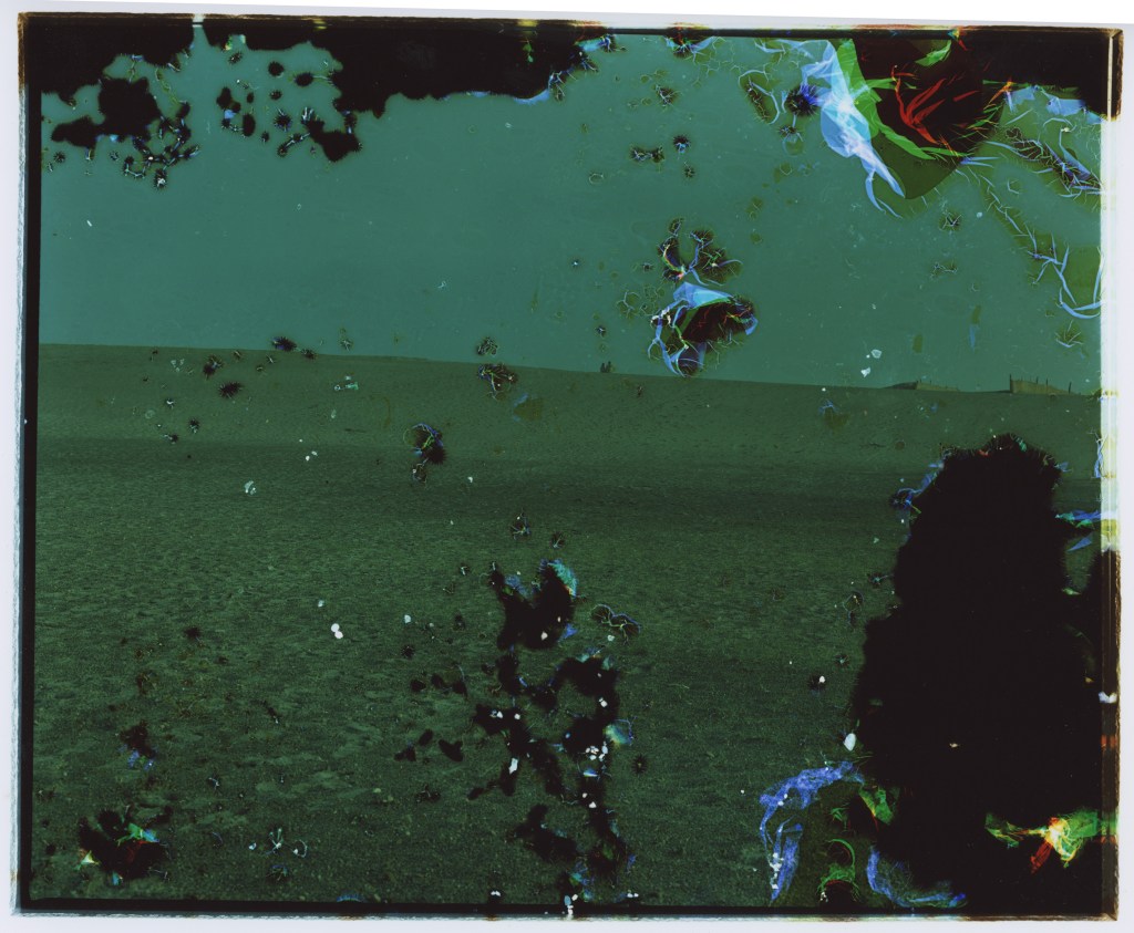 硝子は写真の黎明期に感光板の役割を果たし、今日も「透明」という性質から、様々な光学機械に用いられている。この作品は写真のフィルムを硝子に見立てて、稲毛の海辺の風景を撮影し、硝子の身に降りかかるであろう外界の刺激を加えて作成。硝子に降り注いだ過去の光に思いを馳せるための試み。